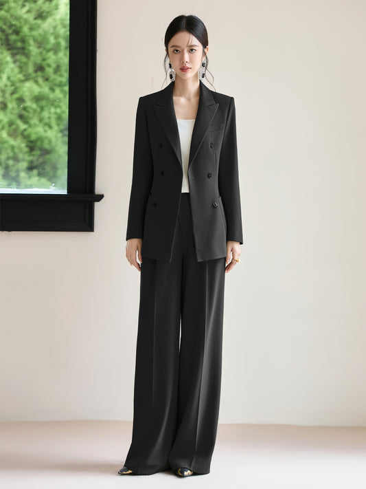 The blazer features a classic double-breasted closure, adding a structured and polished look that is perfect for professional and formal settings.